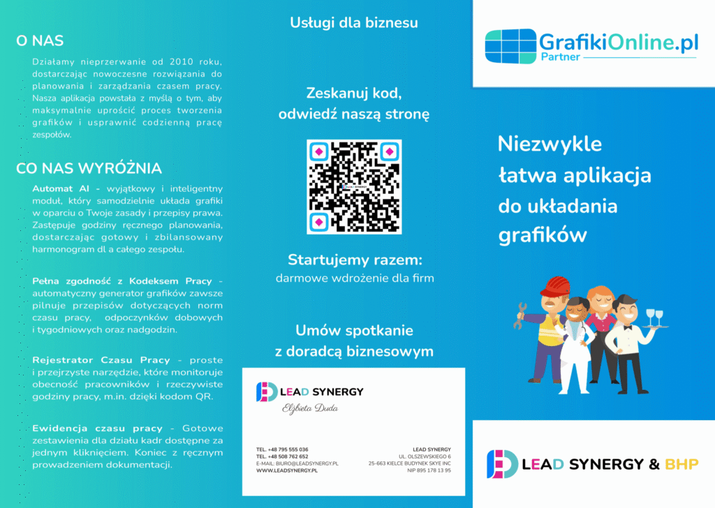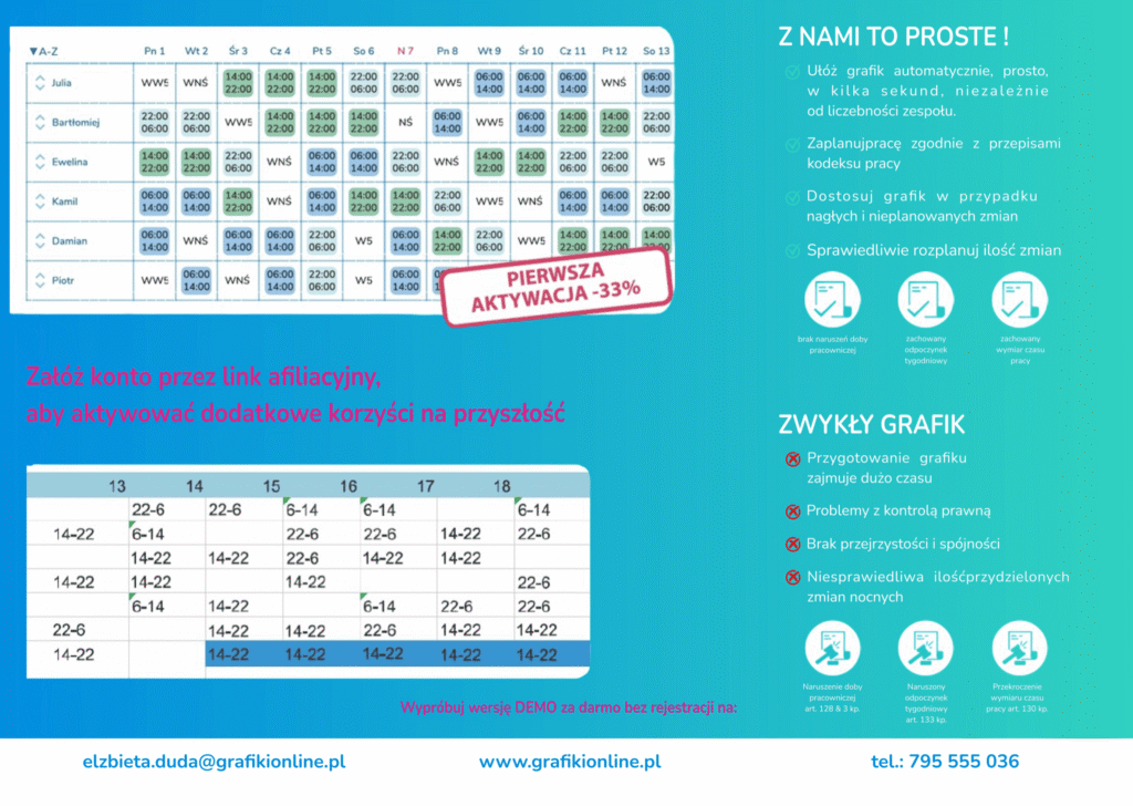 Zapanuj nad grafikami w kilka kliknięć! Zadzwoń do nas – dla nowych użytkowników mamy coś ekstra, co sprawi, że zarządzanie zespołem stanie się czystą formalnością. Porozmawiajmy o Twoim komforcie!